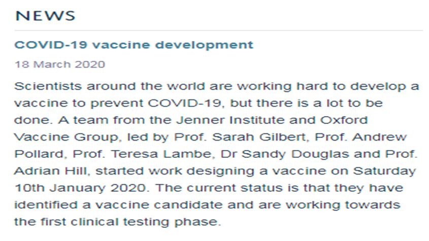其中牛津大学詹纳研究所(Jenner Institute)的一个疫苗小组从2020年1月10日开始疫苗研制,目前已经获得一种候选疫苗。