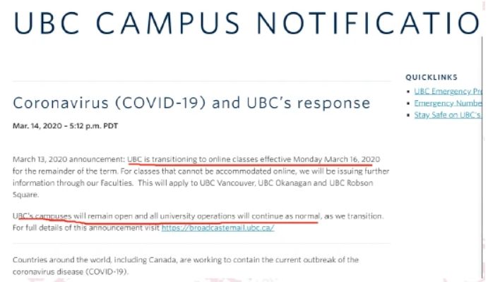ubc将过渡到在线课程,校园仍然开放,所有大学运作正常进行。