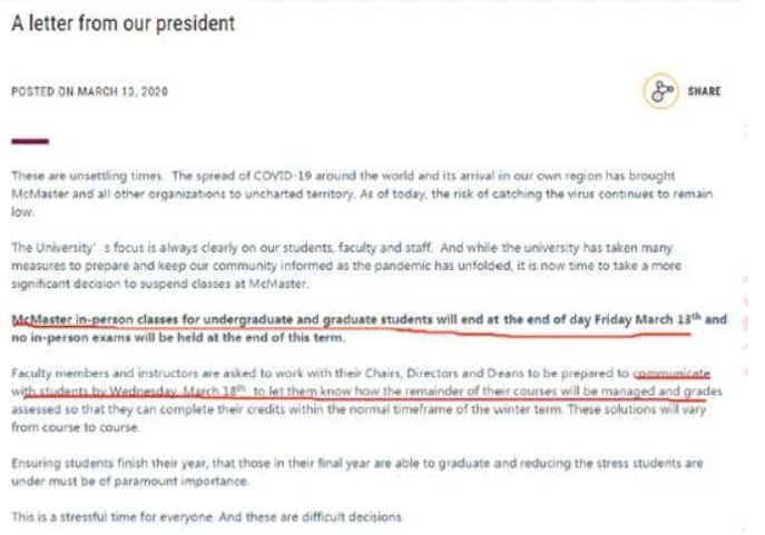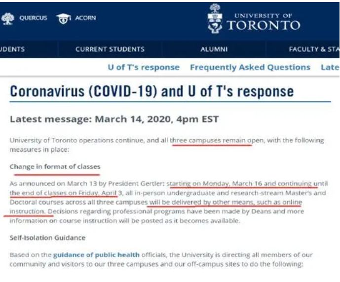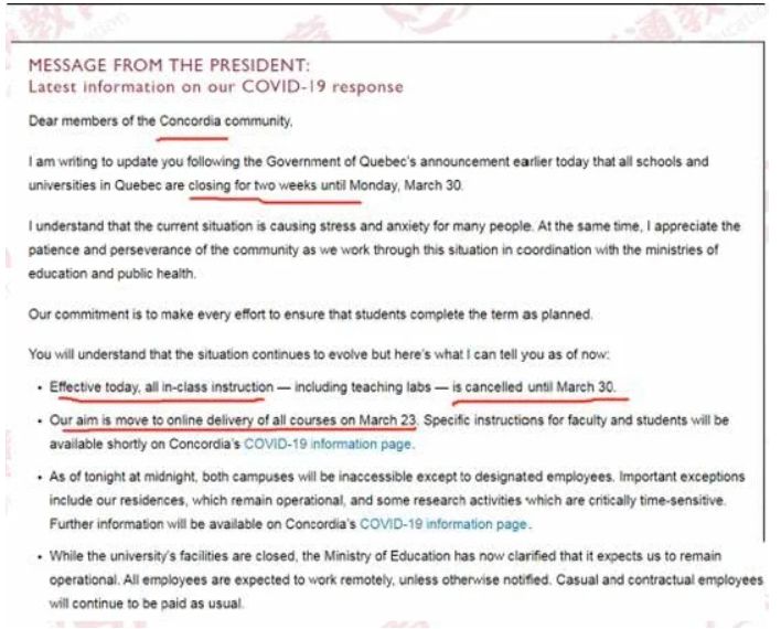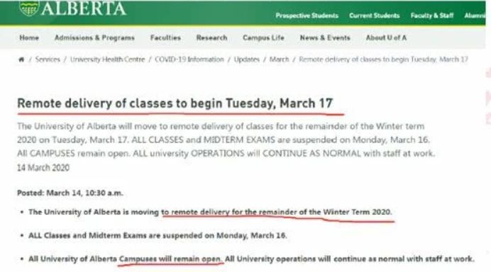 3月13日起暂停本学期所有线下课程全部取消, 3月18日之前授课教授会公布对余下的课程作业及评分方法以确保学生拿到学分。