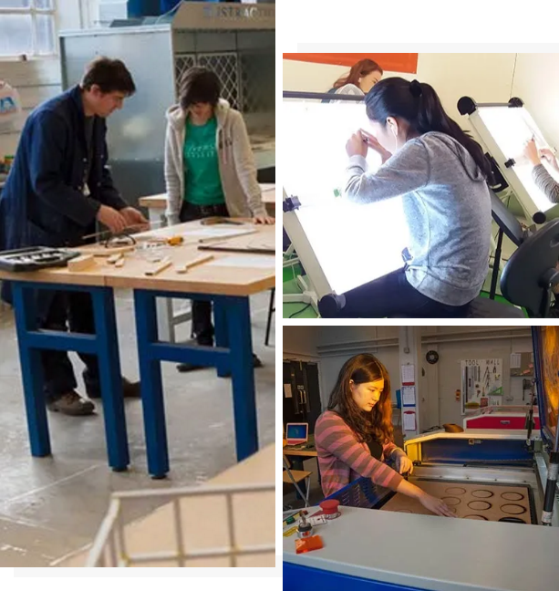 此外,两个高配置计算机实验室也开放给学生使用。一个配有52台Core i7 PC,另外一个配有12台Apple iMac。所有电脑均已装载Aobe Photoshop,InDesign,Acrobat,Illustrator和AutoCAD等软件。学院还有两个模型制作车间,一个激光套件和一个CNC铣刨室。设备包括3轴CNC铣床,4台3D打印机,5台激光切割机,各种传统的模拟木工机械,包括带锯,台锯,各种砂光机,喷漆房,钢锯,电动工具和手动工具。最大限度地为学生们提供技术支持。