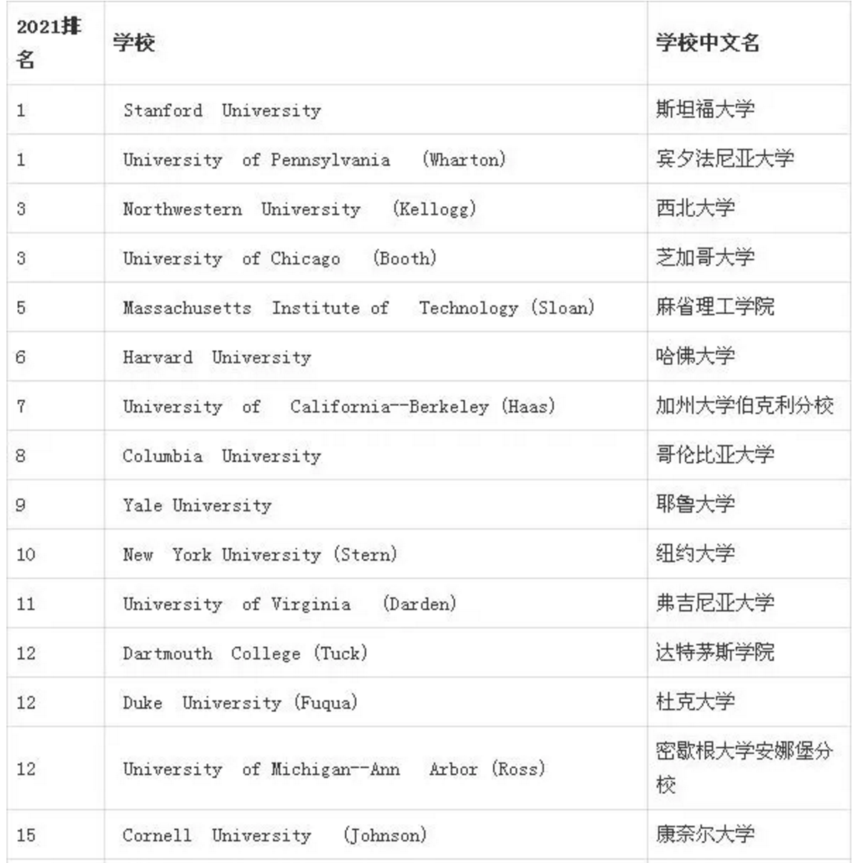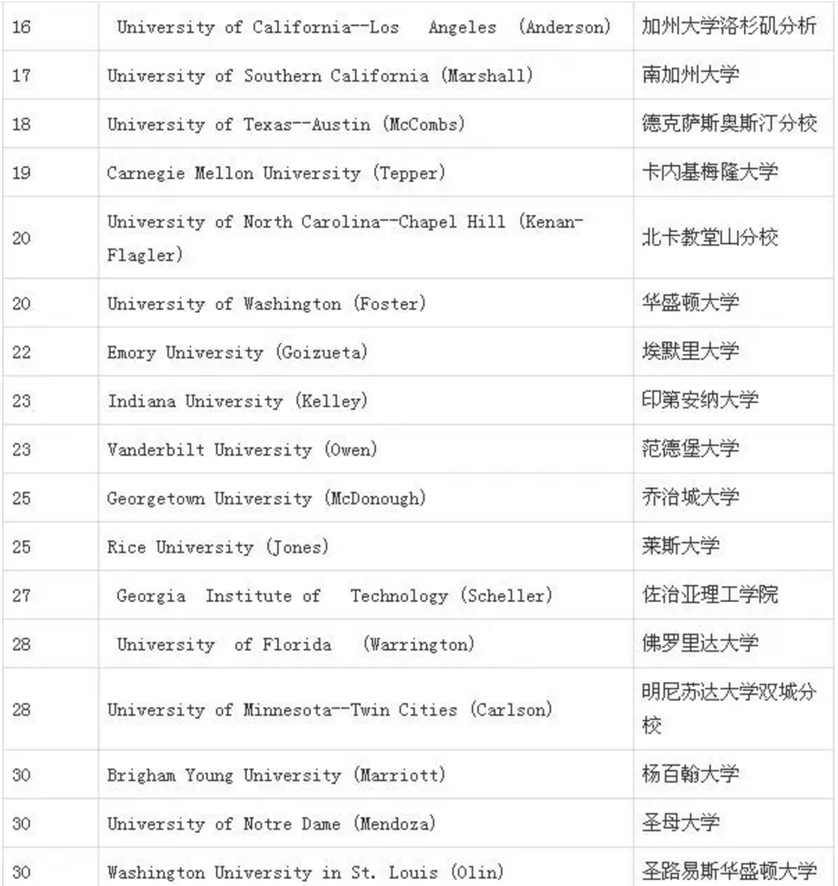 商学院共对477所学校进行了排名,斯坦福大学上升1名与宾大并列第一;西北大学从第7一跃至第3,而哈佛由第3降至第6;NYU Stern 进入前十。进入TOP30的学校新增了明尼苏达大学双城分校和杨百翰大学。