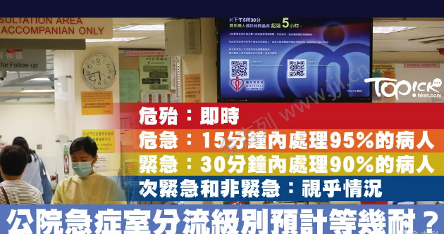 可拨打999,会有救护车送去最近的公立医院急诊室。香港的救护车免费,急诊费需要$100。到达医院后,会被分为危殆,危机,紧急,次紧急和非紧急。通常来说,情况危殆的病人不需要等候,医护人员会立即赶来。其他类别的病人等候时间如下图: