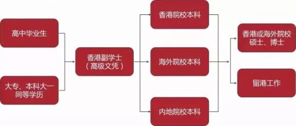 成绩中等者也可进入香港教育大学、香港树仁大学等,中华人民共和国教育部认可的大学的大三学年。这些院校的排名远高于国内二本大学,例如香港教育大学在亚洲教育专业排名第二,全球第十二。