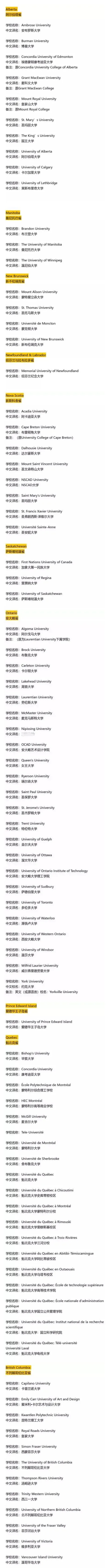 中国教育部认可的加拿大大学 (University) 名单