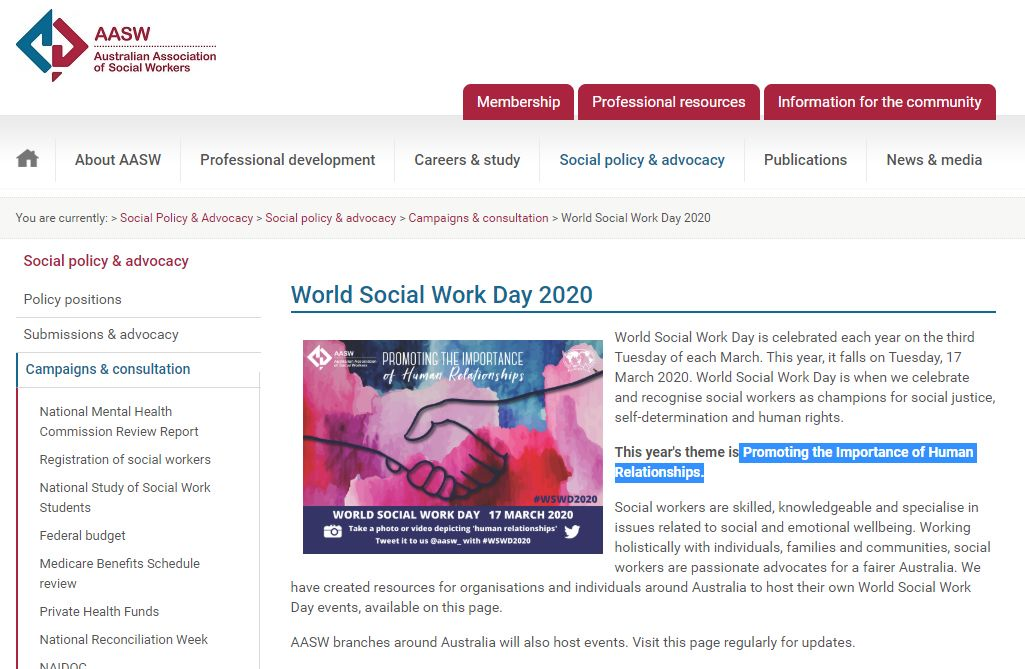 澳大利亚社会工作者协会(Australian Association of Social Workers,简称AASW)也在官网发布了对这一国际庆祝日的重视。