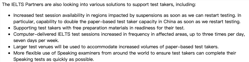 同时大家也别慌,雅思官方还制定了一系列【新政策】来帮助不能正常参加考试的考生,主要包括以下举措: