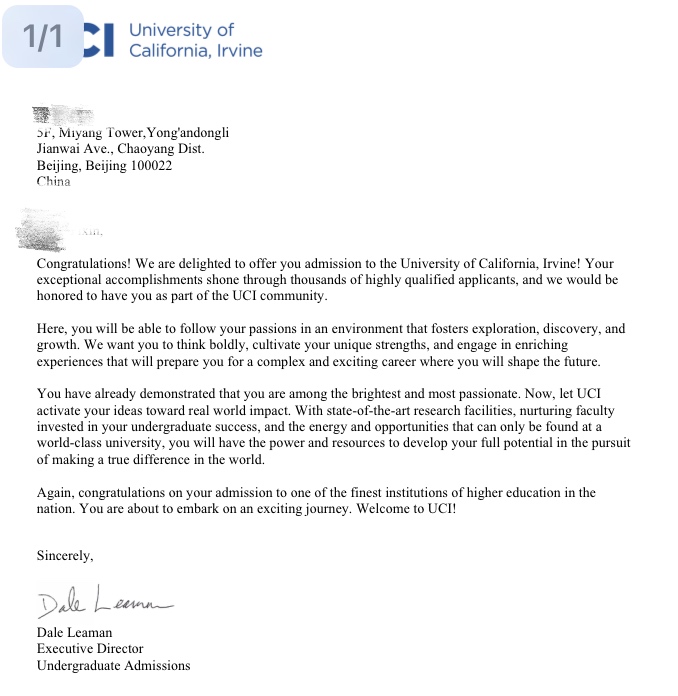 录取院校:加州大学欧文分校