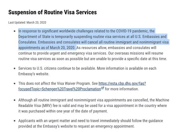 申请美国2020年秋季入学的学生 影响最大的是国内申请美国2020年秋季入学的,目前已经拿到院校录取的学生。 如果疫情持续,美国签证暂停预约短期内无法恢复,可能会导致这部分学生无法正常赴美,准时到校注册。 但我们也需要看到,这次美国签证预约暂停,是为了避免国外人口输入美国,减少新冠肺炎的输入病例。相信随着疫情的结束,美国大使馆会增加工作人员,来应对处理积压的签证需求。 疫情大概率会在6月份可控,所以六七八月份会是签证的,请各位同学及时做好签证准备。 目前的疫情和签证暂停,对学校的录取工作是没有任何的影响, 对于今年拿到offer的同学,要尽快确定入读学校,给学校提交换取签证用的I-20文件资料,首先确保签证材料的齐全,做好签证准备,一旦疫情缓解,签证重新开放,第一时间预约签证。 如果疫情持续,导致同学们无法及时在八九月份到校注册, 我们已经拿到的offer也不会失效,目前从很多美国学校给天道学生的邮件反馈来看,可以延期入学或者可以通过线上网课的方式来上课直到可以入境美国。 美国的院校是非常希望国际生到美国来就读的,会根据疫情的发展帮助学生解决注册,上课的问题。 同学们可以及时查看邮件,等待确定入读院校的邮件消息通知。 大家也可以直接和学校沟通,询问例如延期入学,身份延期等事宜。 如果学生动作比较快,目前已经预约了美国签证,所有已经付费的签证预约费用依然有效,签证申请费自支付之日起一年内有效, 申请人可以等待由美国驻华使领馆正式宣布恢复签证面谈服务后再做预约,不用重复缴费。 如果是已经递交了签证申请但正在被“行政审查check”的同学, 则需要做好长期等待的准备了, 往年正常情况,check时间大概在1-2个月,时间比较长的会到2-3个月,今年疫情影响导致签证预约暂停,原本就很随机的审查时间可能又会被延长,护照本可能还得再等很久才能回到你手里。 需要办理身份转换的同学不要回国,在美国境内完成身份转换, 美国移民局从3月18日到4月1日关闭办公室。但是他们还是可以后台处理申请的身份转换工作的。有了相应结果也会通知。 另外,移民局网站也登出了最新通知。 B1/B2旅游签证,因疫情无法回国,可申请延长留美时间;F1学生签证,因疫情影响经济困难,可申请校外工作。
