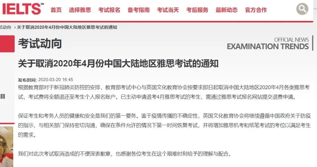 根据教育部对于新冠肺炎防控的安排,教育部考试中心与英国文化教育协会按要求即日起取消中国大陆地区2020年4月各类雅思考试 ,考试费将全额退还至考生个人报名账户。已主动申请退考4月雅思考试的考生,需通过雅思考试报名网站提交退费申请。