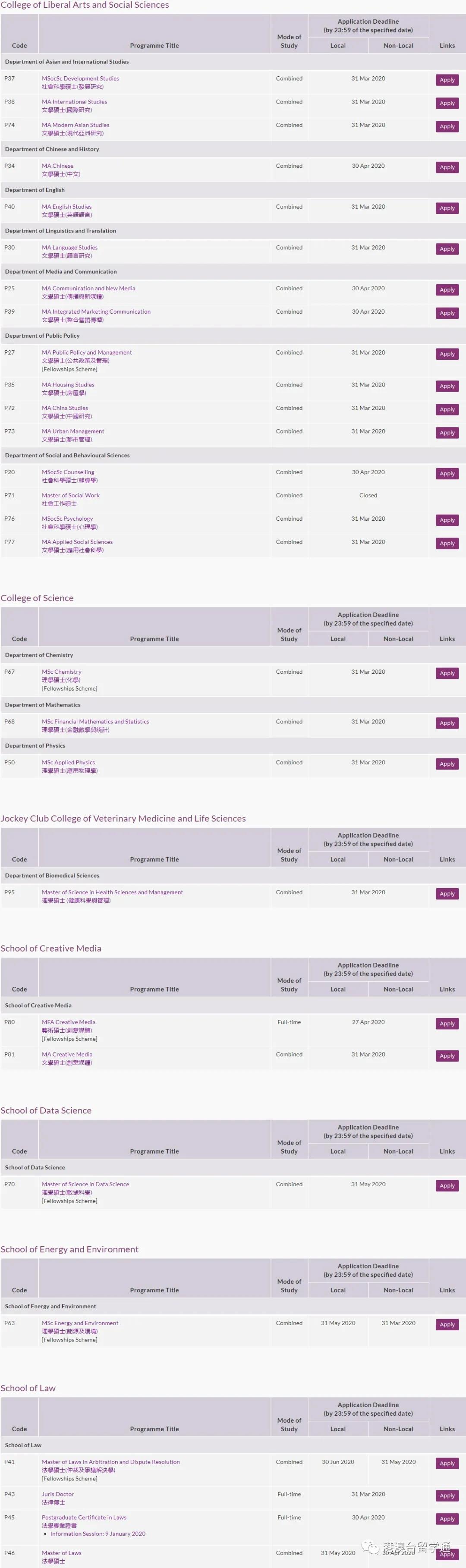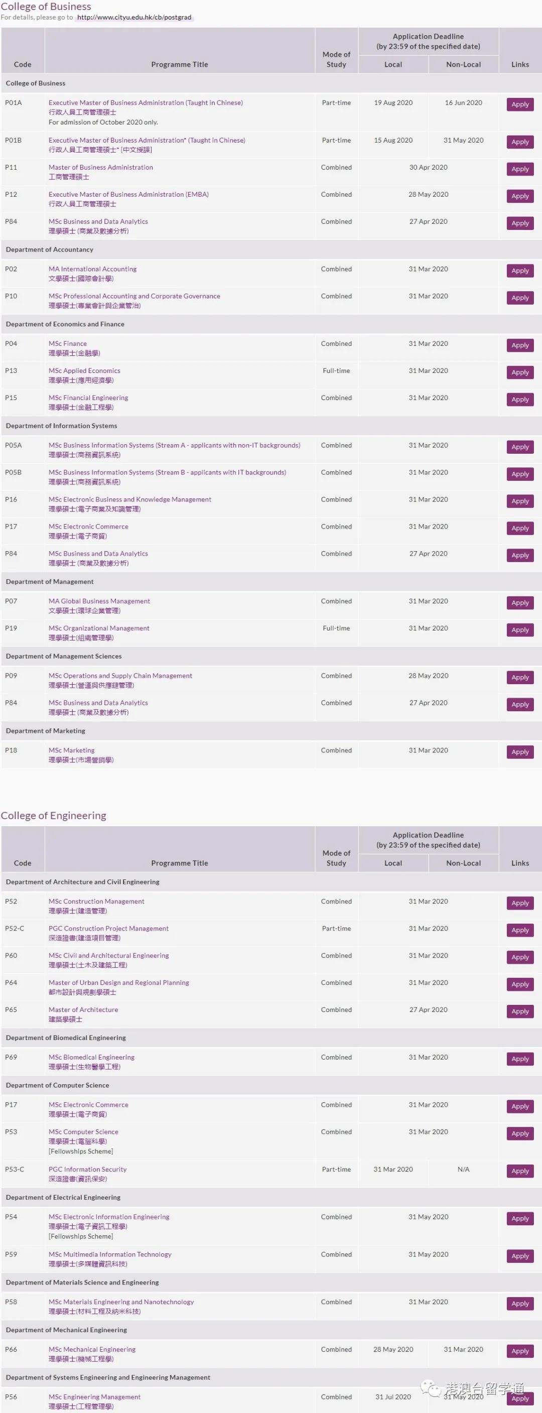 下面,我们先看看,香港城市大学各个专业的申请截止时间。