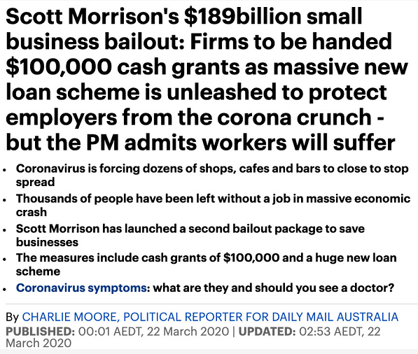 在3月12日宣布的第一套措施中,莫里森宣布将给四分之一的澳大利亚人$750。现金将发放给650万人,其中包括360万养老金领取者,110万学生和工龄福利领取者,以及150万其他人(包括退伍军人和获得家庭税收减免的父母)。
