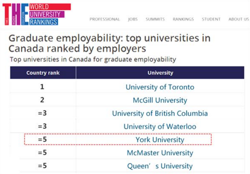 之前提到过,约克大学曾被泰晤士高等教育专刊最受雇主欢迎的加拿大大学第5位 ,仅次于带有医学院的多大、麦吉尔和UBC。医生的就业率可以说是100%,但国际学生能进入医学院的比率却微乎其微。 而约克大学作为没有医学院的综合类科研型大学,能名列前5,让大家能直观的了解到约克大学毕业生就业情况有多好!