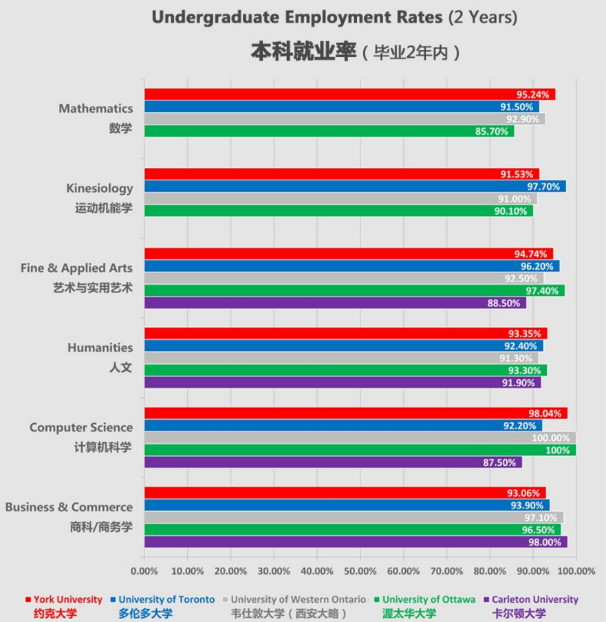 以下列举安大略省几所著名大学的各学科的就业率的数据图: