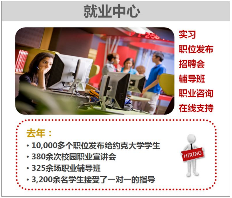 约克大学的就业指导中心,每年为本校学生提供大量独有的招聘资源、举办多场宣讲会/招聘会、并提供免费的一对一简历辅导……最大化你成功的可能性!