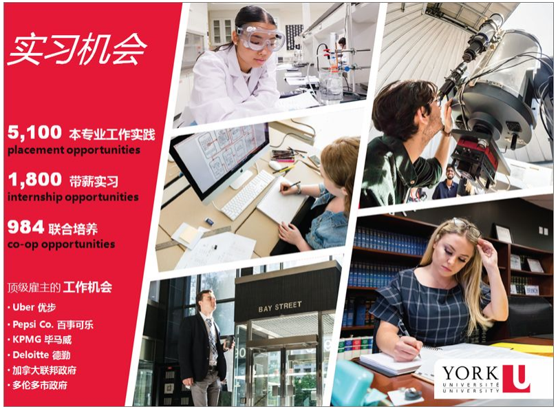 最难找的工作是什么?是你 人生中 第一份工作!白纸一张的简历很难敲开雇主的大门。实习机会帮你解决这个难题! 约克大学每年提供近万个带薪/不带薪的实习(internship)和联合培养(co-op)机会。 (比如普通商科学生,只要大一至大三均分保持在B(70%)以上,约克大学100%提供带薪实习的面试机会。)