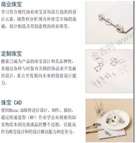 毕业生主要就业方向包括: 时尚设计师,时尚营销策划师,珠宝设计师,珠宝 MD(营销总监),创立珠宝品牌,中高等设计讲师等。