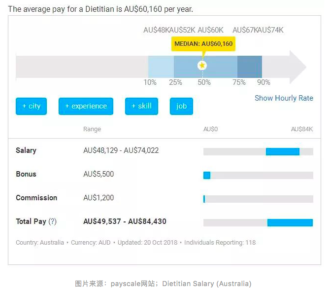 在澳洲,膳食营养师和普通营养师属于发展前景良好的专业人士,这对于目前正在学习食品营养生物化学等专业或高中在读喜欢生化科目的同学提供了很好的机会,据数据分析,澳洲营养师的平均收入达到AU$60,106,折人民币约30万元左右。