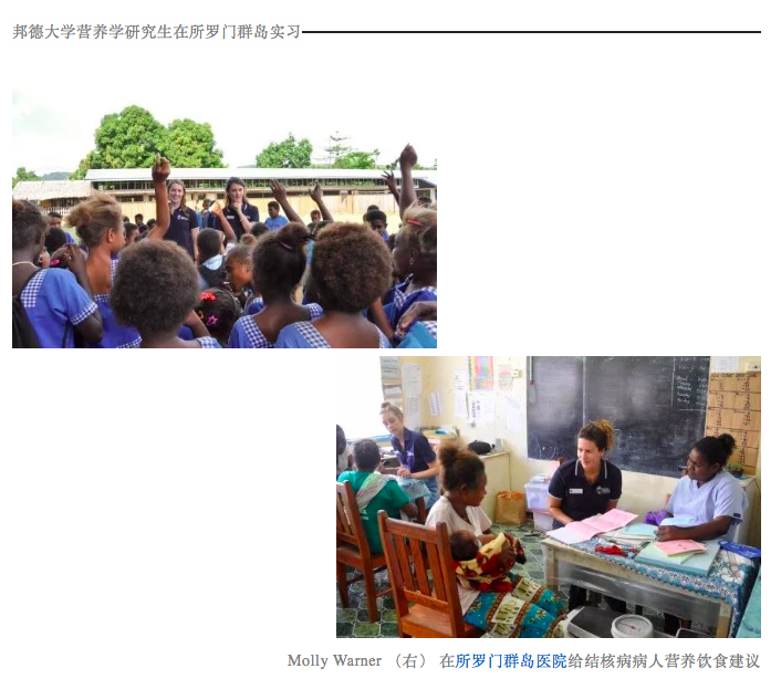 满足条件 的学生还有机会获得 海外实习 的机会 ,比如往届营养学研究生Molly Warner和其他3位同学,来到了所罗门群岛,在当地学校,医院和医疗机构开展 健康营养调研和宣传教育 。