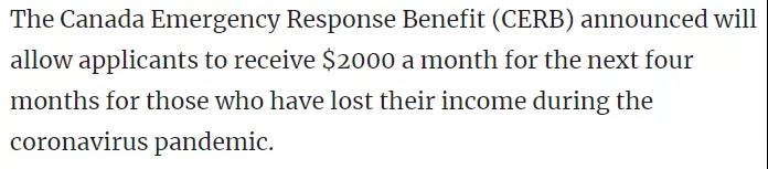 特鲁多表示,所有因新冠疫情失去收入的加拿大人,都可以获得每月$2000的加拿大紧急救助金(The Canaa EmergencyResponse Benefit,简称CERB),并可以持续领取4个月。