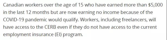 简而言之,只要你年龄在15岁以上,在加拿大工作,在过去的12个月内,赚取了超过$5000的收入,但现在因为新冠疫情没有收入,那么你就符合领取这8000块钱的资格!即使你是自由职业者,即使你不符合EI标准,通通没关系,你可以领钱!