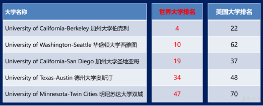 在U.S. News大学排名中,UCB在美国综合大学排名列第22,而在世界大学排名高居第4。为什么世界排名比美国排名还能高这么多?其实不止UCB,以下学校在世界大学排名中表现远比其美国大学排名高很多: