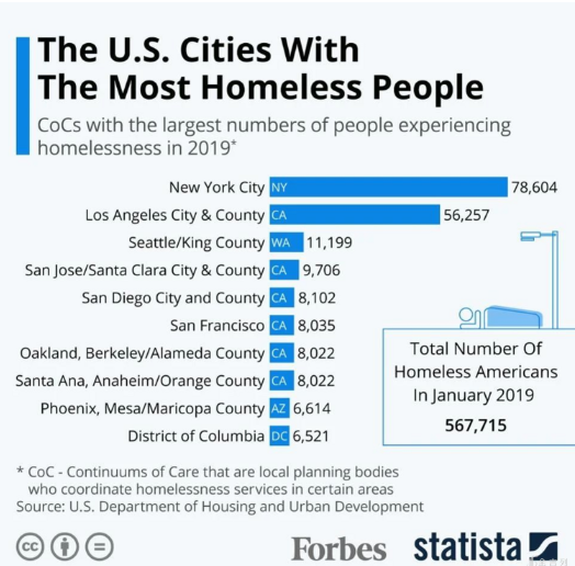 我们再来看看美国其他地区的流浪汉问题,下图展示了美国流浪汉数量前10的地区, 排名前两位的是第一大城市纽约和第二大城市洛杉矶 ,分别有7.8万和5.6万名流浪人员。大家心里想,这可是中国学生最想去上学的地方啊,还能去吗?