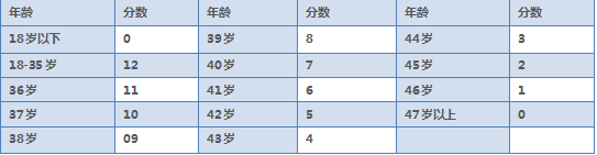 年龄:满分12分,18至35周岁拿到满分,每加一岁减1分