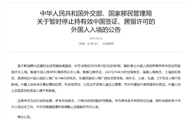 鉴于新冠肺炎疫情在全球范围快速蔓延,中方决定自2020年3月28日0时起,暂时停止外国人持目前有效来华签证和居留许可入境。暂停外国人持APEC商务旅行卡入境。暂停口岸签证、24/72/144小时过境免签、海南入境免签、上海邮轮免签、港澳地区外国人组团入境广东144小时免签、东盟旅游团入境广西免签等政策。持外交、公务、礼遇、C字签证入境不受影响。外国人如来华从事必要的经贸、科技等活动,以及出于紧急人道主义需要,可向中国驻外使领馆申办签证。外国人持公告后签发的签证入境不受影响。