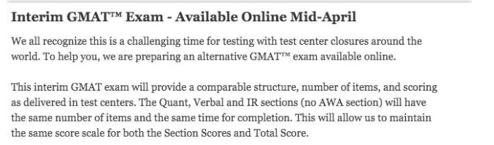 根据官方公布的信息, GMAT将在4月中旬实行线上考试Interim GMAT™ Exam。