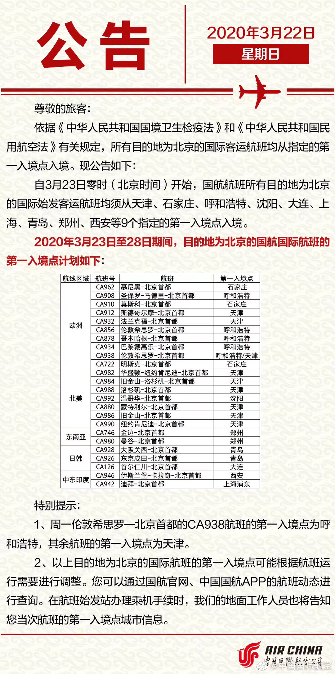 民航局确定了各航空公司指定第一入境点