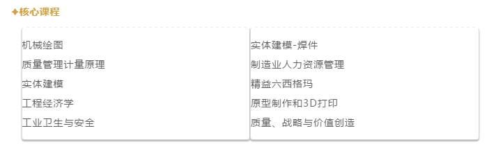 该专业为全日制2年研究生文凭证书专业 ,面向工程和工程技术专业的毕业生。 学习期共两年,主要围绕补充性实践培训和制造车间经验展开学习,扩展学生的理论知识。学生还可以在实践学习中接触到以后工作中会遇到的情况。 该专业课程包括实体建模、加工、计算机数控(CNC)编程课程(加工方向)或图纸解读和焊接符号(焊接方向)。 此外,应用学习的内容还包括车间实习、巩固理论和实践知识的高级项目。该专业还涵盖了质量保证、过程和项目管理方面的学习,教授学生如何从运营和战略角度应对生产环境中的挑战,注重培养学生的领导技能、有效管理复杂制造过程能力以及管理团队实现业务目标的能力。 毕业生可以从事制造行业监督或管理职位。学生还会了解到制造、通信、人力资源和安全实践方面的最新发展,日后有能力为制造业贡献出自己的力量