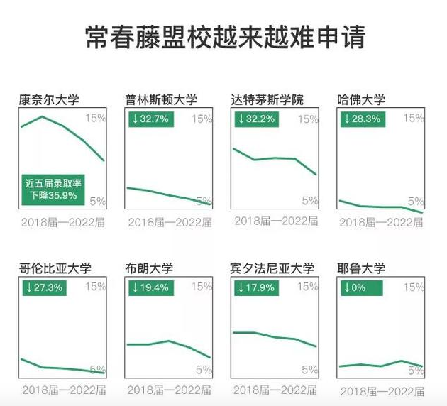 常春藤盟校是指由哈佛大学、宾夕法尼亚大学、耶鲁大学、普林斯顿大学、哥伦比亚大学、达特茅斯学院、布朗大学及康奈尔大学八所顶尖高校组成的联盟,申请藤校在中国留学圈被称为“爬藤”。藤校公布的本科新生的录取数据显示,近年来“爬藤”已经变得越来越难了。