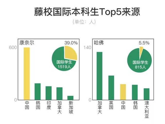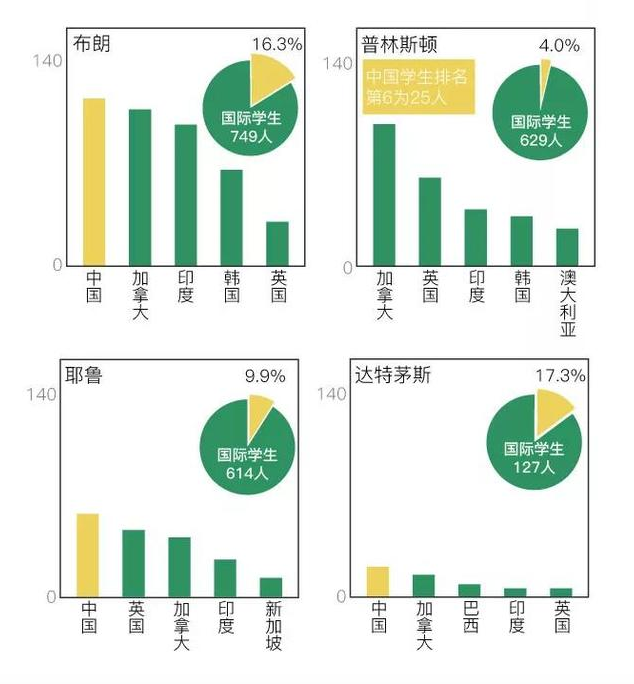 “爬藤”虽然越来越难,但从哈佛、普林斯顿、耶鲁、康奈尔、布朗和达特茅斯这6所藤校最新公布(耶鲁为2016年秋季入学数据,其余为2018年秋季)的国际学生录取数据来看,中国学生在国际学生中依然名列前茅。