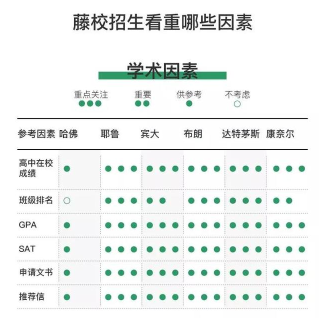 耶鲁大学、布朗大学和达特茅斯大学对所有学术类因素都给予了“重点关注”的最高等级。哈佛大学对于学术类因素的关注程度是藤校中最低的,甚至声称不考虑申请人高中阶段的在校排名。