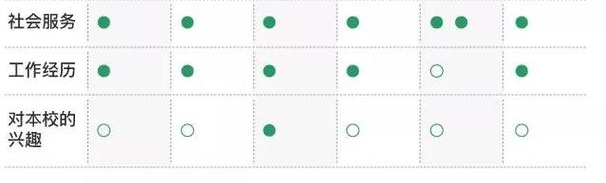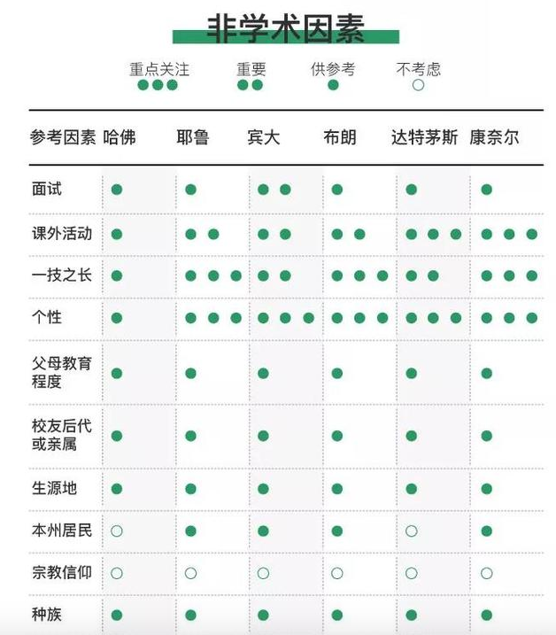 在非学术类因素上,6所学校在父母的教育程度、是否为校友等指标的关注度上基本相同。另一些指标则反映了学校招生上的“个性”,如宾夕法尼亚大学比较“在乎”学生是不是对本校感兴趣,达特茅斯大学会考虑新生是否有社会服务经历。