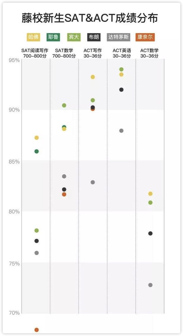 公布这方面数据的6所藤校里,在SAT单项700-800和ACT单项30-36分的高分段,藤校新生的占比平均达到了78%以上。