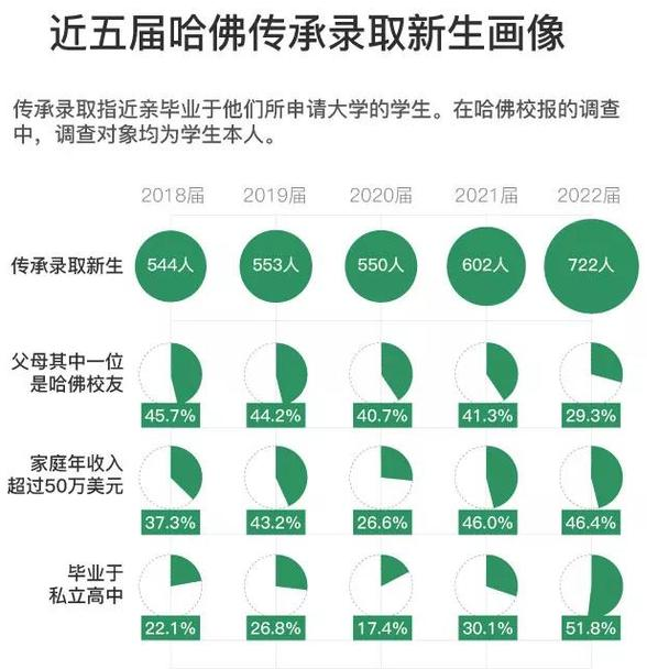 在哈佛大学的录取规则中,只要是父母其中一人、兄弟姐妹、祖父母或是其他亲属念过哈佛大学的,申请人都可以算作是传承录取者。在2022届哈佛新生中,每3个学生中就有1个是传承录取者。近五届新生录取数据显示,哈佛大学传承录取新生占新生总人数的比例从26.9%上升到了36.8%。