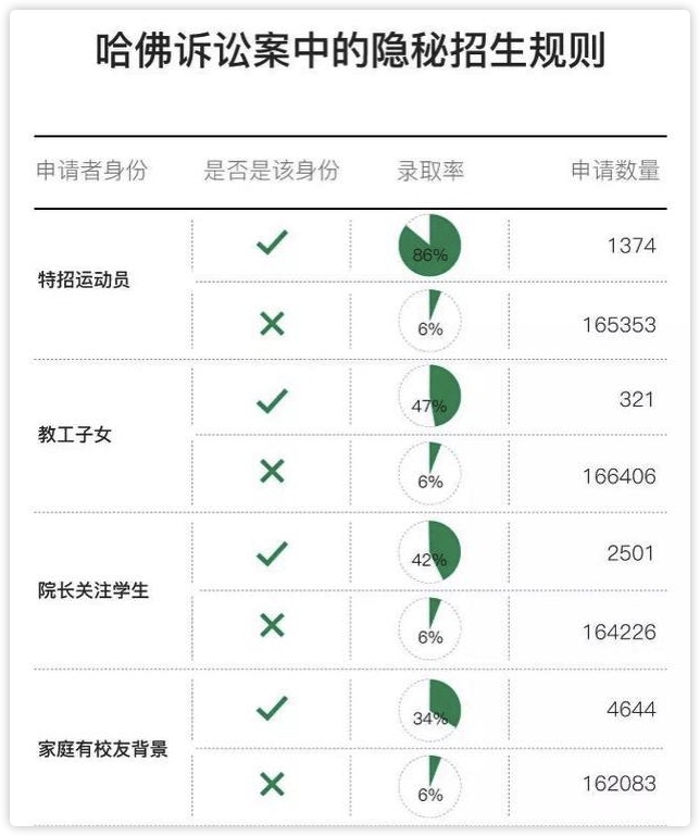 在卫报披露的一份法庭文书中,哈佛大学对于不同身份的学生有着截然不同的录取比例。其中,特招运动员的录取率最高,达到了86%;学校教工子女排在第二,为47%,均远高于哈佛大学6%的平均录取率。