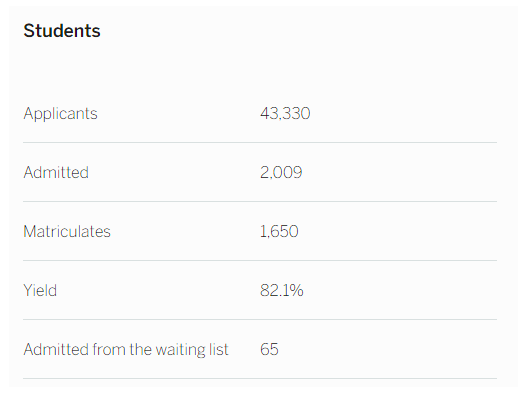 耶鲁大学今年一共收到了35,330份申请,最终宣布录取招收2,304名学生, 总录取率为6.52% ,比去年还高了一丢丢…