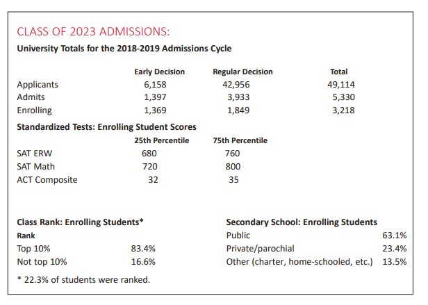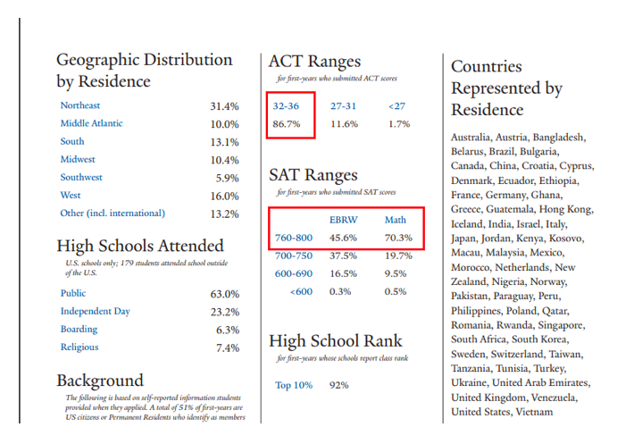 康奈尔大学基本是在藤校中录取中国学生最多的学校,去年录取人数竟然达到了90人。SAT EBRW 680-760, SAT Math 720-800, ACT 32-35.