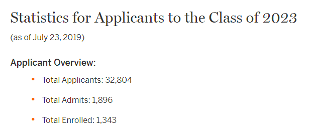 普林斯顿大学去年的申请人数为32,804人,学校录取了1,896人,录取率仅为5.8%! 根据官网统计,录取平均成绩为SAT Math 750-800, SAT EBRW 710-770, ACT 33-35.