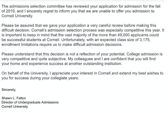 我翻开邮箱一查,这些拒信没有理由,歪歪斜斜的每页上都写着‘都很优秀’四个字。我横竖睡不着,仔细看了半夜,才从字缝里看出字来,满本都写着两个字是‘不配’!在ED被Cornell翠拒后,我收到了整整齐齐10封拒信。每一封拒信我都留下来读了很多遍,翻来覆去不过是一些差不多的理由。不痛不痒的几句话很难让我的心态平静下来,左想右想觉得招生官们还是需要一位“暴躁翻译官”。今天,我总结出了每一封拒信的套路,并帮助他们翻译了“暴躁版内心OS”。