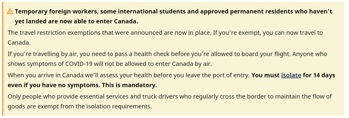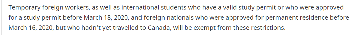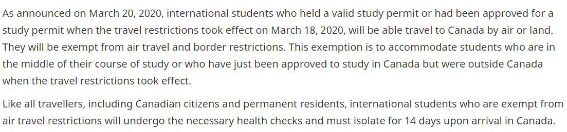 2020年3月20日,加拿大政府出台了旅行限制,以阻止COVID-19的传播。临时外籍工作者以及持有有效学习签证或在2020年3月18日之前被批准学习签证的国际学生,以及在2020年3月16日之前被批准的永久居民将不受这些限制。