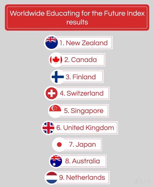 2017年《经济学人》智库发布 《全球未来教育指数》白皮书。共调查了美国、英国、加拿大、澳大利亚、中国、新加坡等35个全球经济体的未来教育指数,并深入采访了17位来自全球的教育专家。报告显示,新西兰综合排名第一。