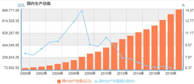 我们从消费者的角度 来分析这个问题,对于一个家庭决定是否让孩子去美国留学,最主要的一个决策因素是家庭的经济实力,那么这19年中国的经济是一种什么样的走势呢?