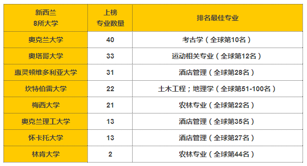 专业排名只有进入全球前三百名才具备排名资格, 新西兰的八所大学全部跻身全球3%顶尖大学行列。