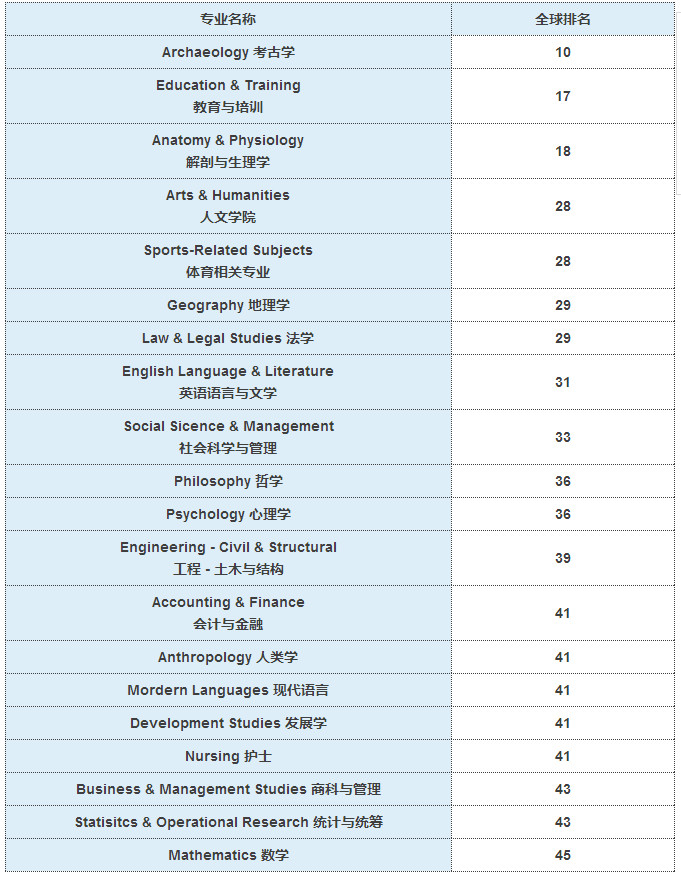 - 该校还有一系列排名在51-100位的学科:英文、历史、心理学、发展研究、地理、地球科学、表演艺术、语言学和考古学等。