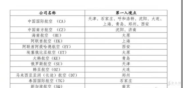 以下,小编给大家看一下民航局确定的各个航空公司指定第一入境点: