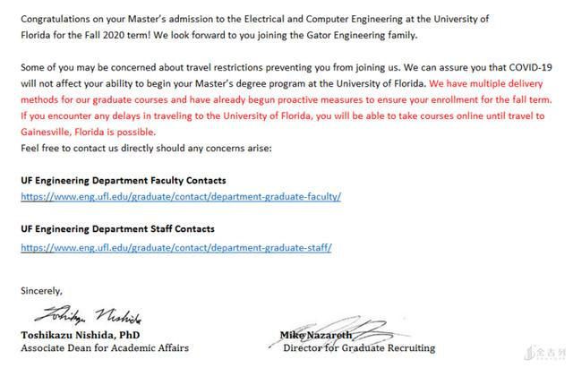 一下是佛罗里达大学给20年秋季入学学生的邮件“关于新冠病毒的事情学校解释说不会影响学生的学习。如果到时候真的因为交通管制没办法入境,学校会安排online的学习。学生如果有任何困难也可以跟学校联系。”