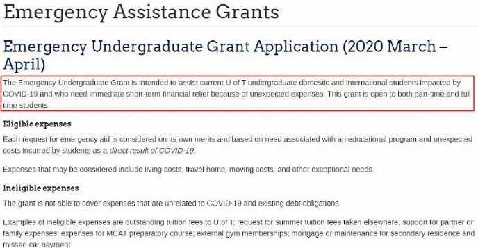 多伦多大学推出的紧急补助金计划针对该校所有受到疫情影响的本科生(包括本地生和国际留学生,Part-time和Full time学生)。